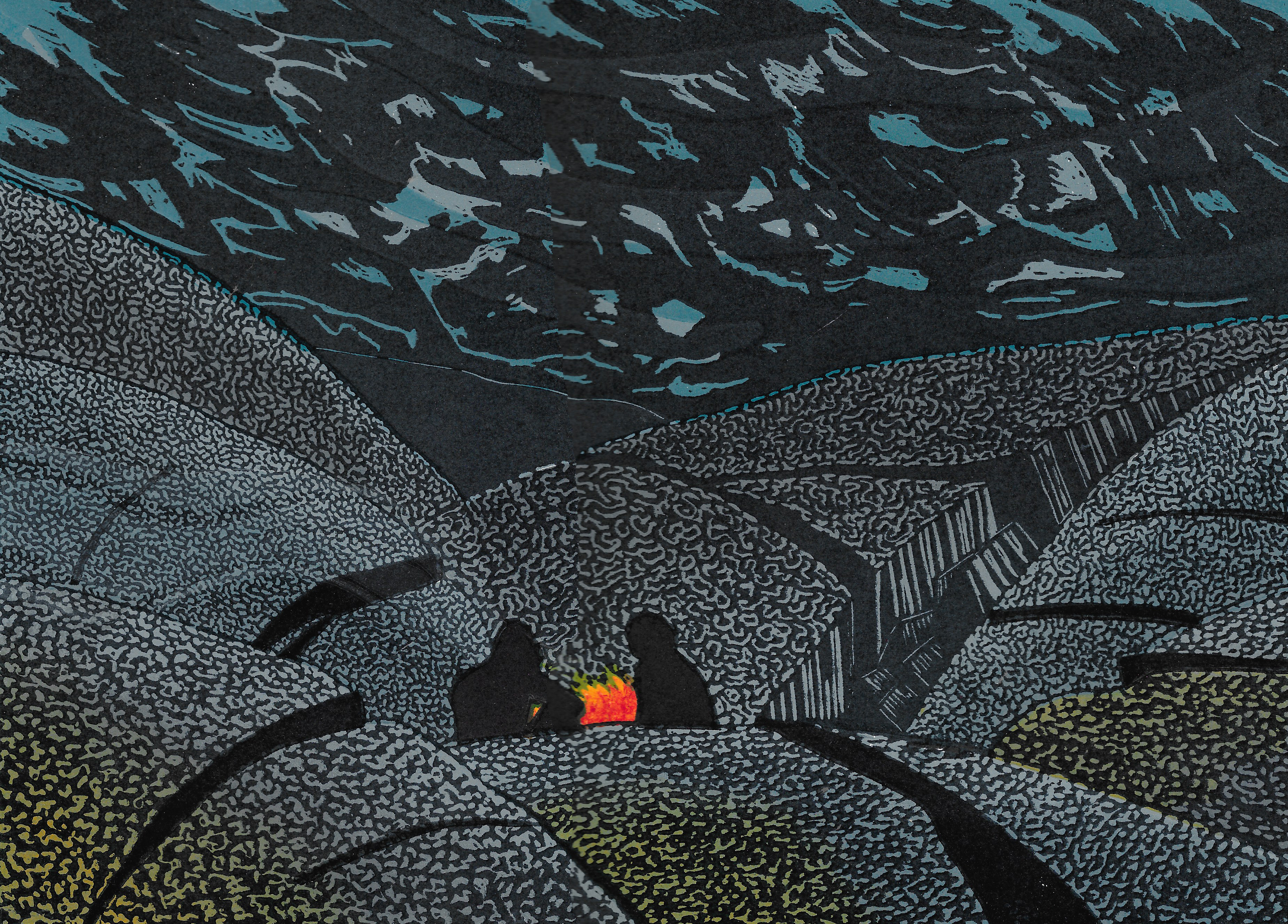Two engravings done with a multiple line tool on a sample of a material I found just before this lockdown. This one, ‘Passing Storm’ has become my covid-19 print. The other, ‘The Watchers’, is like so many kilometers of Georgian Bay shoreline.